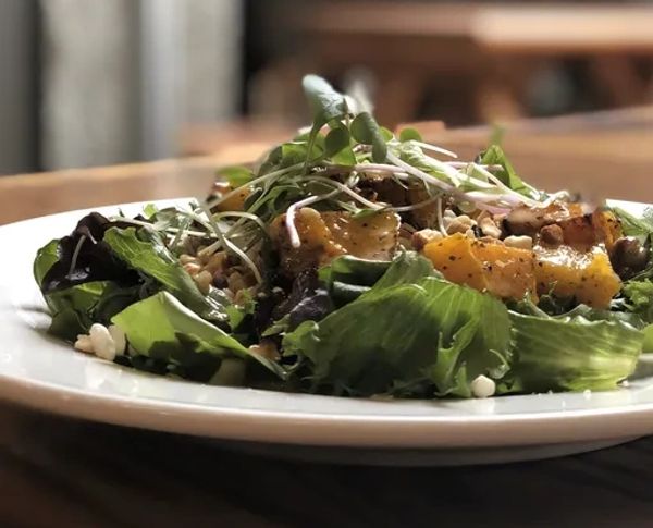 Strawberry & Hazelnut Salad Organic mixed greens with strawberries, crumbled goat cheese, and toasted hazelnuts, finished with blackberry apple cider vinaigrette -gf, vg