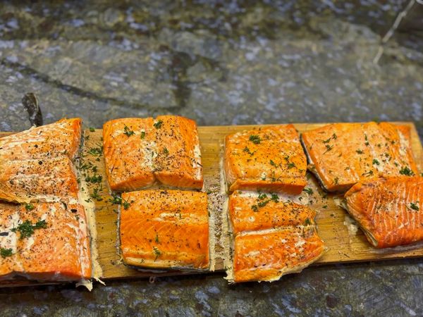 Wild-caught salmon fillet filled with creamy crab stuffing and roasted until tender