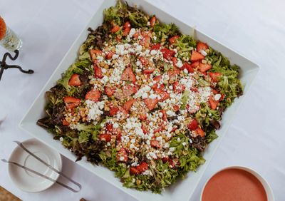Romaine with watermelon, jicama, red onion, pepitas, cilantro, & queso fresco with poblano vinaigrette.