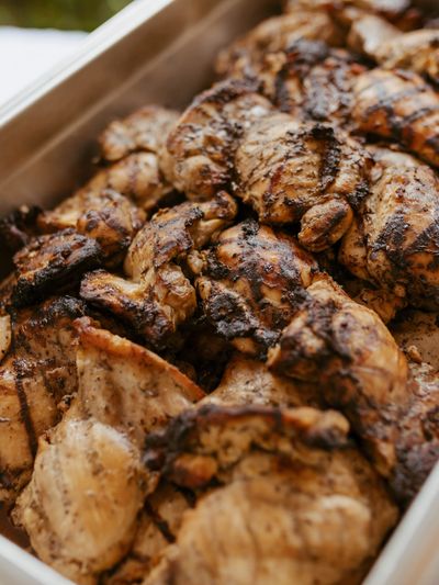 Juicy grilled chicken glazed with sweet bourbon peach sauce