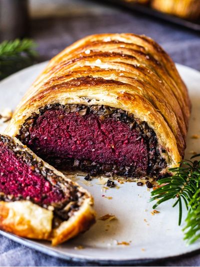Golden pastry wrapped around roasted beets, goat cheese, and herbed mushroom filling